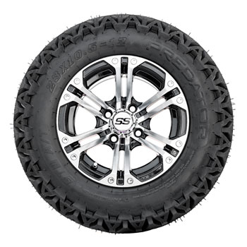 A set of (4) 12-inch Specter black/machined lifted golf cart wheels on 23-inch A/T tires